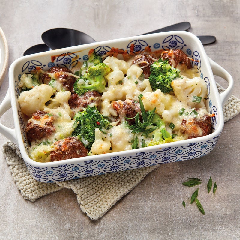 Blumenkohl und Broccoli in Salzwasser ca. 10 Minuten vorgaren. Zwiebel schälen und in Würfel schneiden. Margarine in einer Pfanne auf mittlerer Stufe schmelzen und Zwiebeln darin ca. 3 Minuten andünsten. Zwiebeln mit Mehl bestäuben, mit Milch und Brühe ablöschen und unter Rühren ca. 3 Minuten köcheln lassen. Mit Frischkäse und Schnittlauch verfeinern und mit Salz, Pfeffer und Muskatnuss würzen. Backofen auf 180° C (Gas: Stufe 2, Umluft: 160° C) vorheizen. Gemüse abgießen, gut abtropfen lassen, mit Mozzarella-Hackbällchen in eine Auflaufform (ca. 25 x 35 cm) geben und mit Sauce übergießen. Mit Käse bestreuen, im Backofen ca. 20 Minuten backen und heiß genießen.