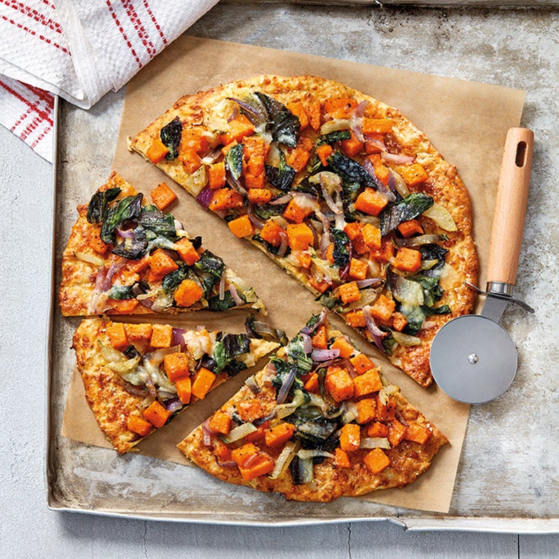 Blumenkohlpizza mit restlichem Mozzarella und Parmesan bestreuen und mit Kürbis-Mangold-Mischung belegen. Im Backofen auf mittlerer Schiene weitere 5–10 Minuten backen, in Stücke schneiden und Blumenkohlpizza servieren.