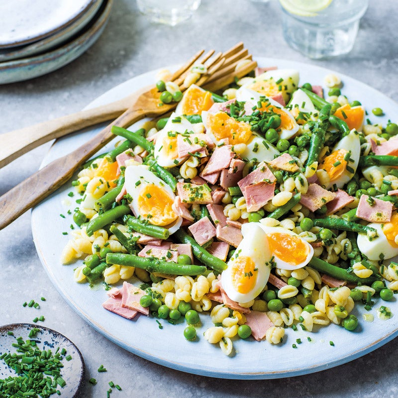 Bohnen-Pasta-Salat mit Ei und Schinken