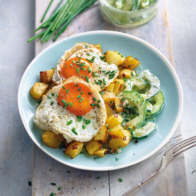 Kartoffelwürfel ohne Deckel weitere ca. 5 Minuten garen, dabei gelegentlich umrühren. Restliches Öl in einer Pfanne auf niedriger bis mittlerer Stufe erhitzen, Eier als Spiegeleier darin 5–8 Minuten braten und mit Salz und Pfeffer würzen. Gurkenscheiben mit Dressing vermischen. Bratkartoffeln mit Schnittlauch bestreuen und mit Spiegelei und Gurkensalat servieren.