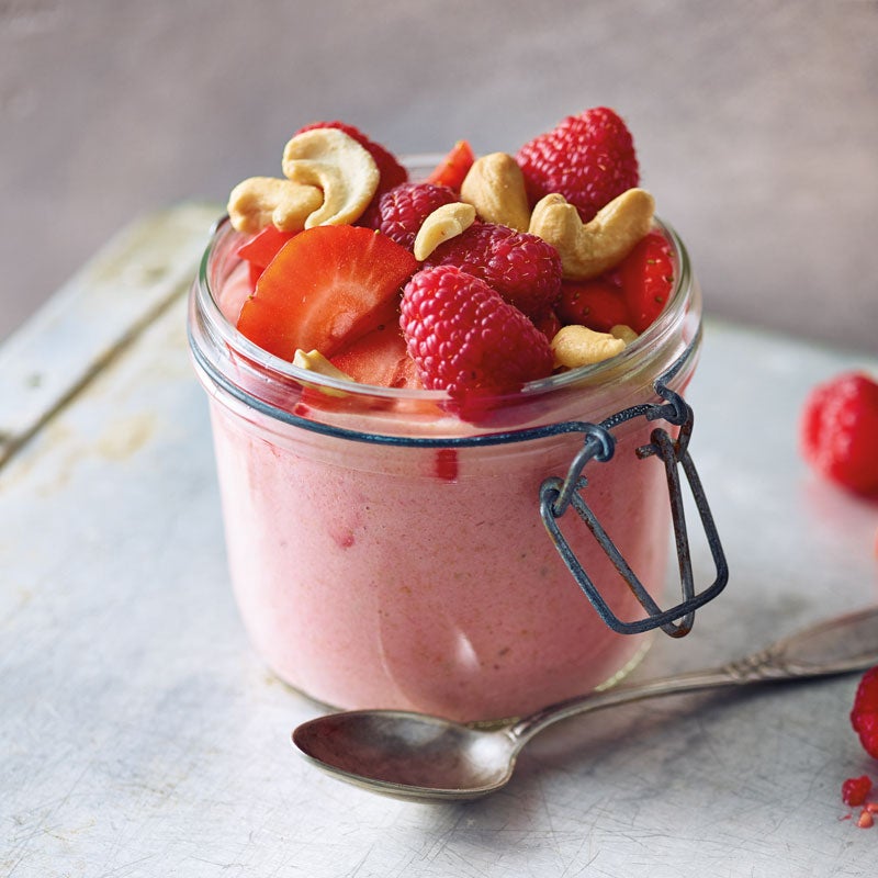 Buchweizenpüree in ein Glas füllen und mit restlichen Himbeeren, Erdbeerscheiben und Cashewnüssen garnieren. Buchweizen-Beeren-Creme servieren.