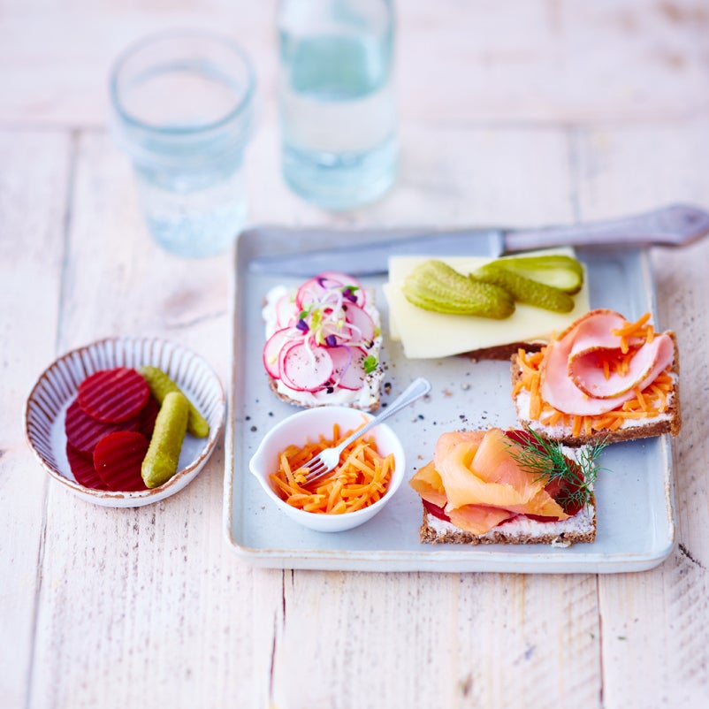 Eine Scheibe Brot mit Meerrettich bestreichen und halbieren. Eine Hälfte mit Kasseleraufschnitt und 1 EL Karottensalat, die andere Hälfte mit Räucherlachs und Roter Bete belegen und mit Dill bestreuen.
