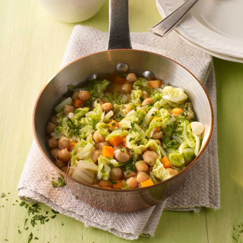 Zwiebeln in kleine Würfel schneiden und Knoblauch zerdrücken. Öl in einem beschichteten Topf erhitzen, beides darin anbraten und mit Brühe ablöschen. Karotten in Stifte und Chinakohl in Streifen schneiden, beides mit Kichererbsen zufügen, mit Salz und Pfeffer würzen und ca. 15 Minuten kochen.