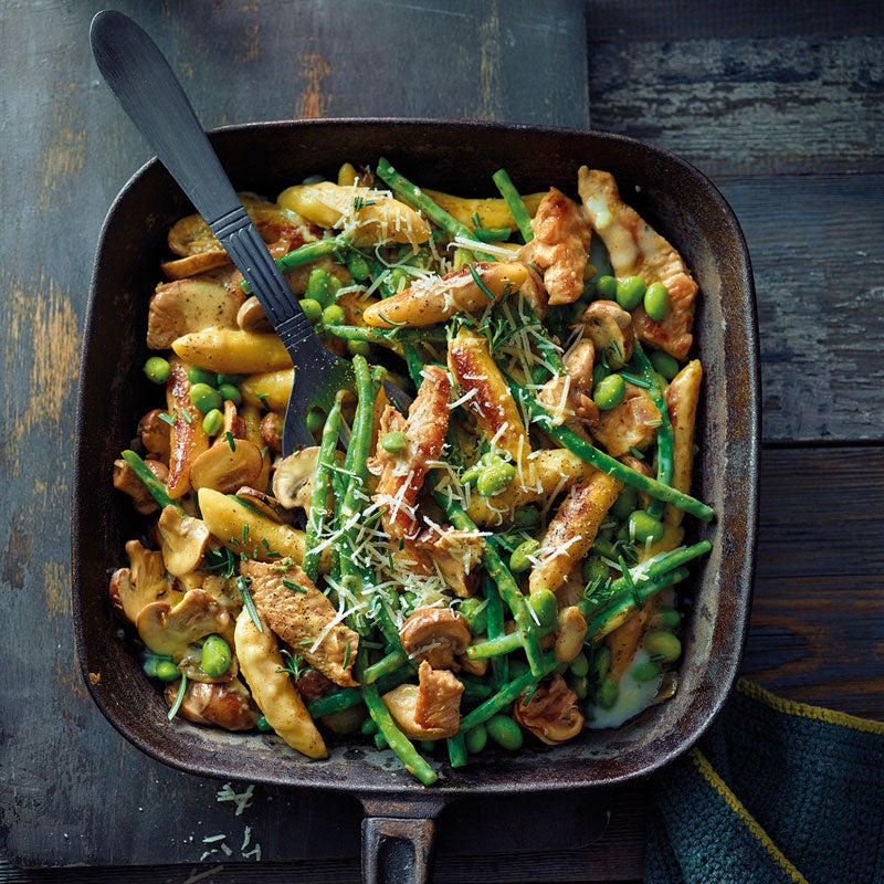 Schupfnudeln, grüne Bohnen und Sojabohnen dazugeben und 5–7 Minuten mitbraten. Mit Brühe und Cremefine ablöschen und aufkochen lassen. Bohnenpfanne mit Parmesan und Rosmarin bestreut servieren.