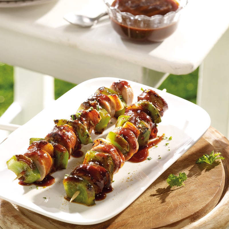 Bratwurst in Scheiben schneiden. Zwiebel schälen, Paprika waschen, entkernen und beides in Stücke schneiden. Bratwurstscheiben, Zwiebel- und Paprikastücke abwechselnd auf 2 Holzspieße stecken.