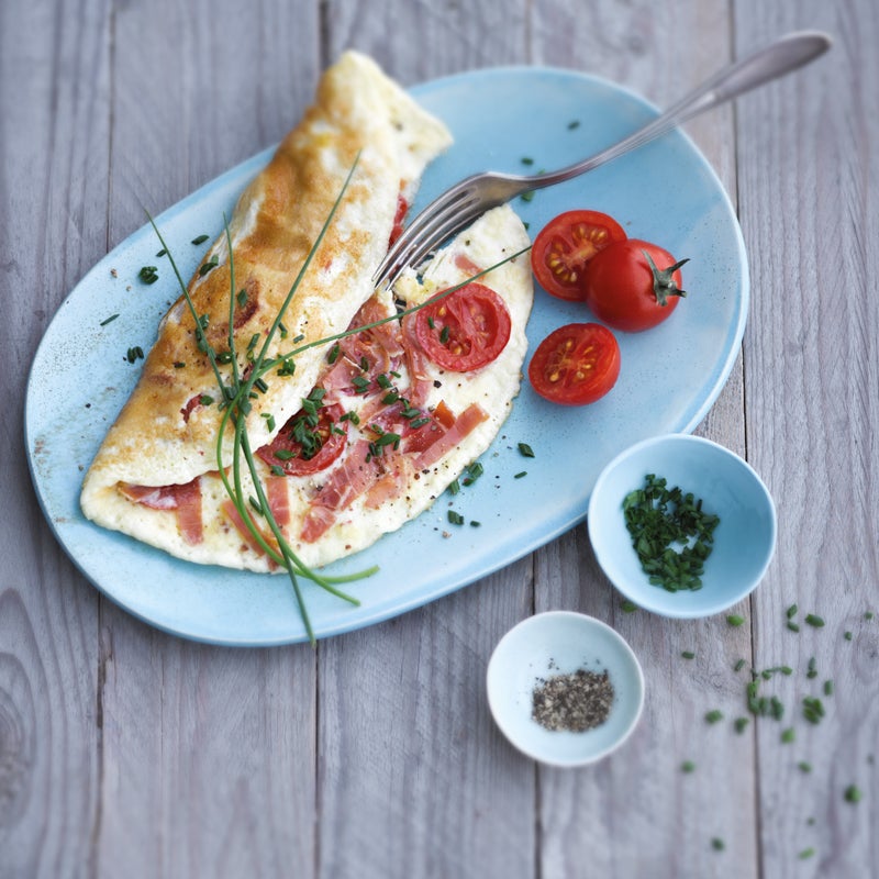Öl in einer Pfanne auf mittlerer Stufe erhitzen, Eimasse zugeben, mit Tomatenscheiben und Schinkenstreifen belegen und mit ca. 5–7 Minuten stocken lassen.