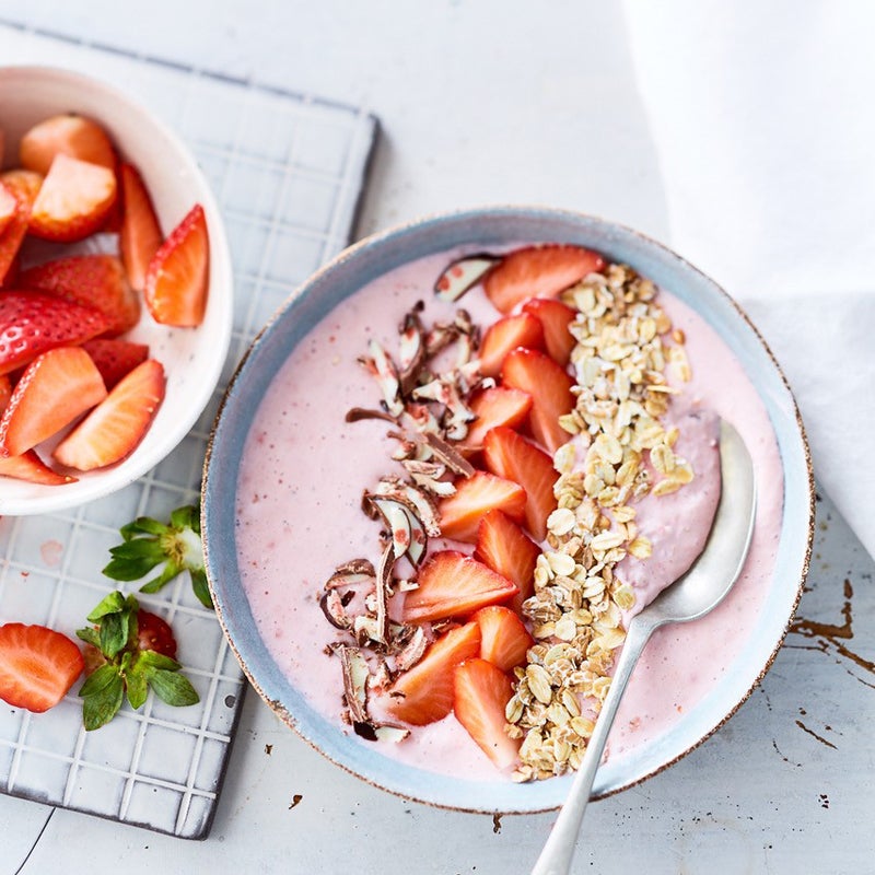 Erdbeeren in Stücke schneiden. Skyr mit 200 g Erdbeeren und Vanillezucker pürieren. Yogurette raspeln.