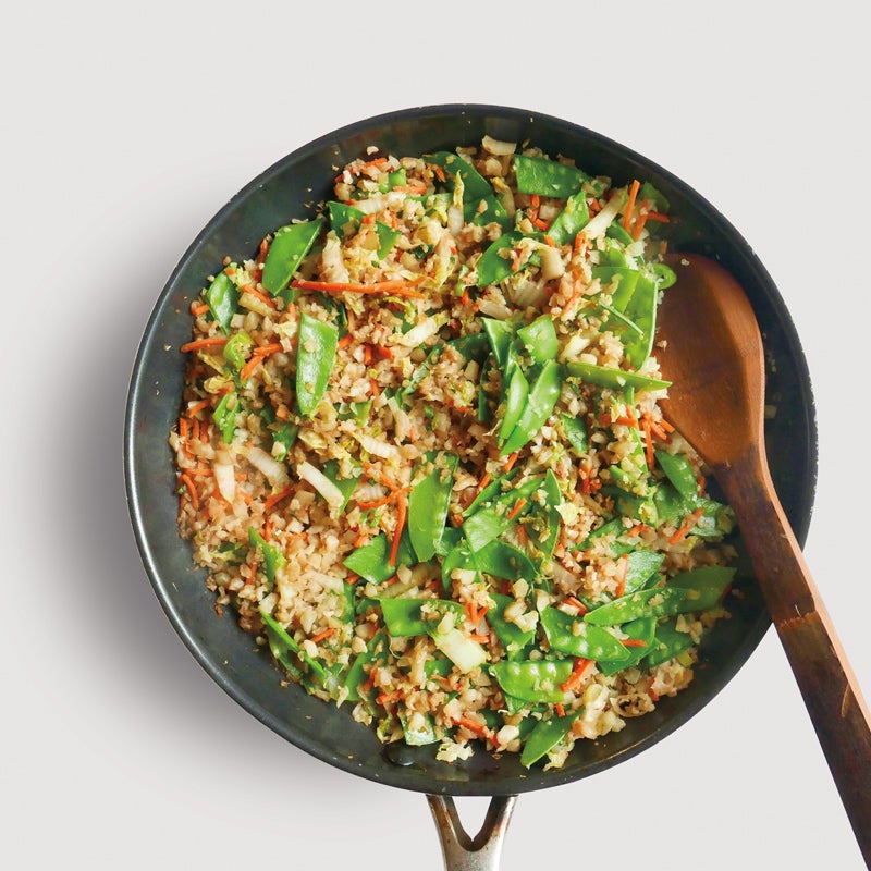 Zuckerschoten halbieren und Zwiebeln in feine Streifen schneiden. Mit dem Blumenkohlreis in die Pfanne geben und 3-5 Minuten unter Rühren braten.