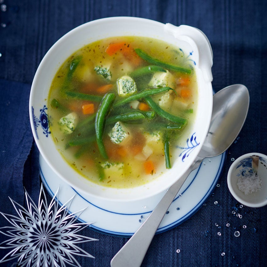 Eierstich aus der Form lösen, in feine Würfel schneiden und zur Suppe geben. Gemüsesuppe mit Salz und Pfeffer abschmecken und servieren.