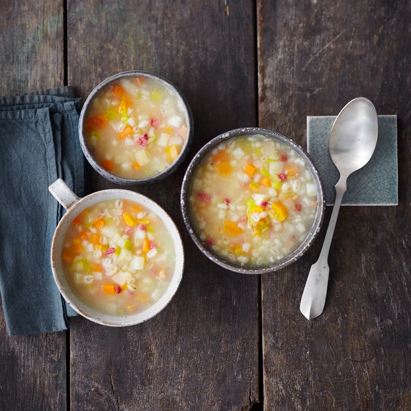 Sellerie, Lauch und Karotten waschen, schälen und in kleine Würfel schneiden. Gerste und Schinkenwürfel in einen Topf geben und kurz andünsten.