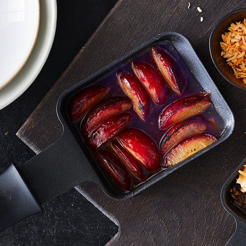 Pflaumen in Spalten schneiden, mit etwas Zucker und Butter in den Pfännchen karamellisieren.