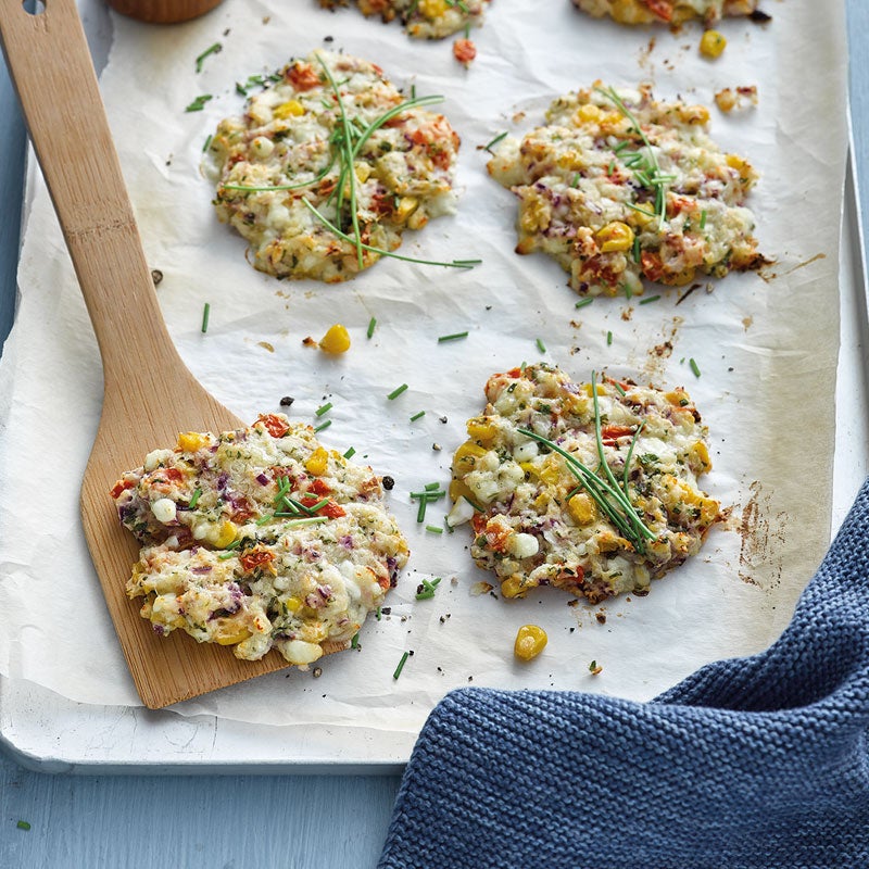 Mehl mit Zwiebel-, Tomatenwürfeln, Hüttenkäse, Mais, Schnittlauch, Petersilie und Rosmarin vermengen und mit Salz und Pfeffer würzen. Masse auf einem Backpapier ausgelegten Backblech zu 6 Küchlein formen und im Backofen auf mittlerer Schiene ca. 20 Minuten backen. Hüttenkäse-Küchlein servieren.