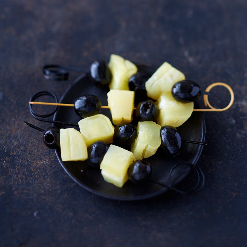 Harzer in 10 Würfel schneiden. Harzer und Oliven abwechselnd auf Spieße stecken.