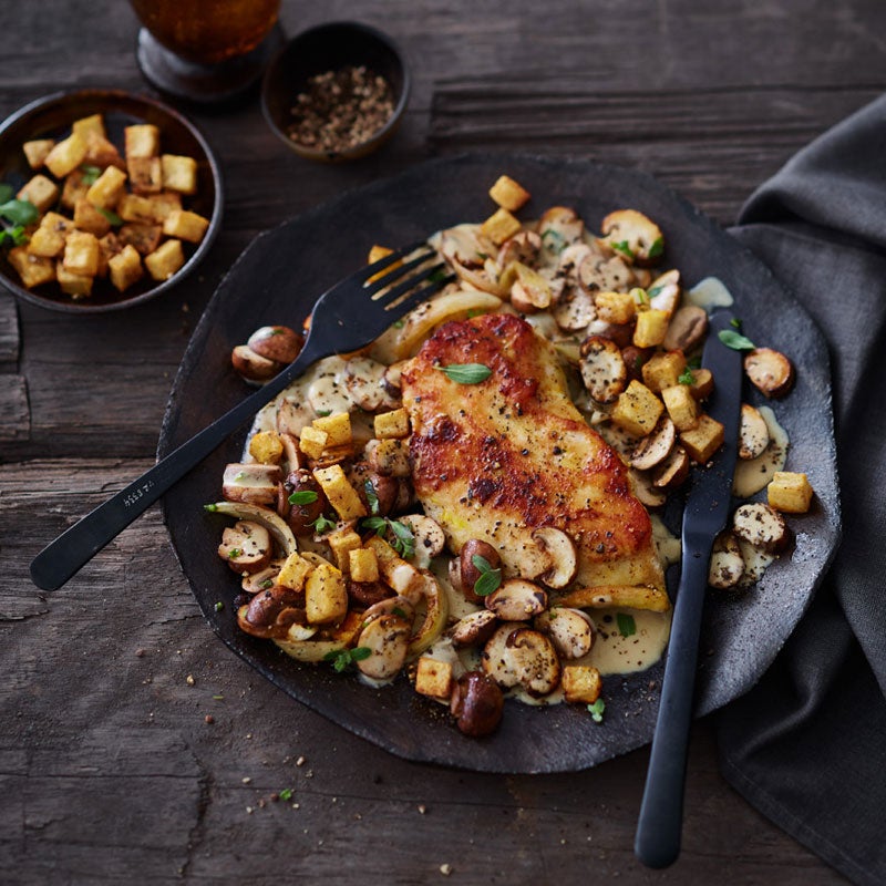 Die Jagd nach dem einfachsten Jägerschnitzel der Welt war erfolgreich. Hier kommt das perfekte Putenschnitzel in cremiger Champignonsauce mit Knusperkartoffeln.