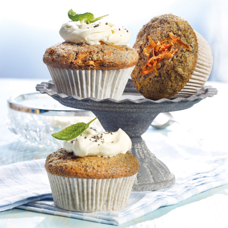 Mulden eines Muffinblechs mit Papiermanschetten auskleiden. Teig einfüllen, im Backofen auf mittlerer Schiene ca. 30–35 Minuten backen und auskühlen lassen. Sahneersatz mit Vanillezucker steif schlagen. Karotten-Mohn-Muffins mit einem Klecks Sahne und nach Wunsch mit Zitronenmelisse und Mohn garniert servieren.