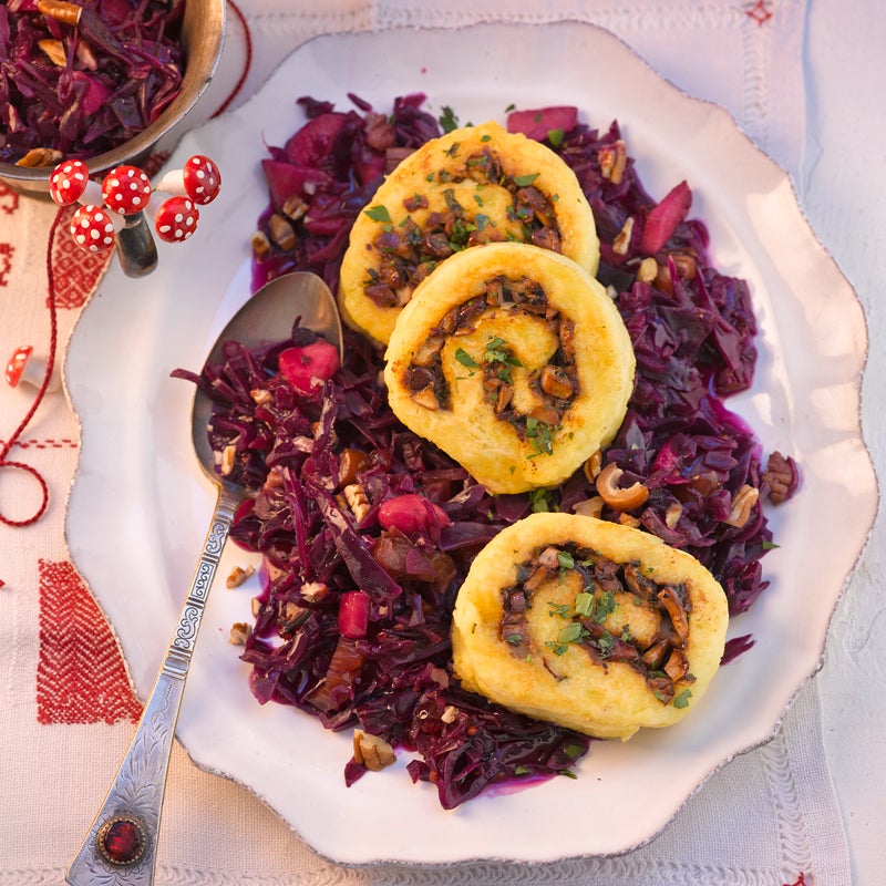 Kartoffel-Steinpilz-Rolle mit Dattelrotkohl