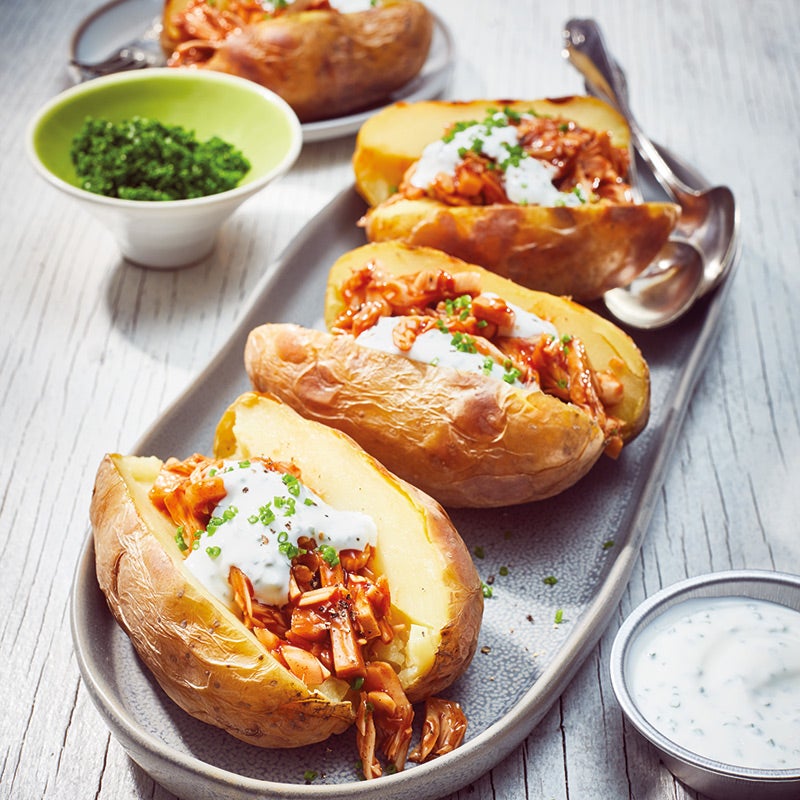 Für den Dip saure Sahne mit Schnittlauch, Salz und Pfeffer verrühren. Jackfrucht abspülen, abtropfen lassen, in kleine Stücke zerteilen und mit Paprikapulver, Cayennepfeffer, Salz, Pfeffer und Barbecuesauce mischen. Kartoffeln aufschneiden, Jackfrucht-Mischung daraufgeben und mit Dip servieren.