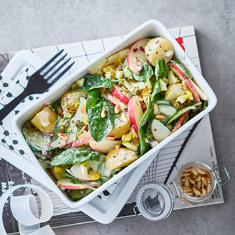 Kartoffeln je nach Größe halbieren oder vierteln. Mit Ei, Gurken- und Apfelscheiben in eine Schüssel geben und mit dem Dressing vermischen. Den Salat mindestens 30 Minuten ziehen lassen, nochmals abschmecken und Spinat vor dem Servieren unterheben. Mit Pinienkernen bestreuen.