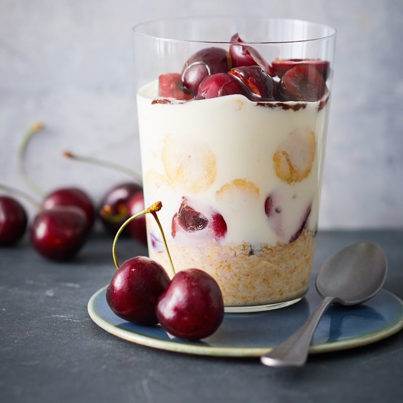 Haferflocken in ein Glas geben und mit Milch aufgießen. Die Hälfte der Kirschen darauf verteilen. Banane in Scheiben schneiden und mit dem Joghurt verrühren. Bananenjoghurt ins Glas geben.