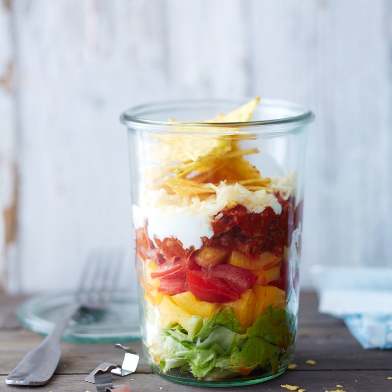 Salat in Streifen, Paprika und Tomate in Würfel schneiden. Nacheinander Salat, Paprika- und Tomatenwürfel sowie Tatarsauce in ein Weckglas schichten. Saure Sahne und Käse daraufgeben. Tortillachips zerbröseln und darüberstreuen.