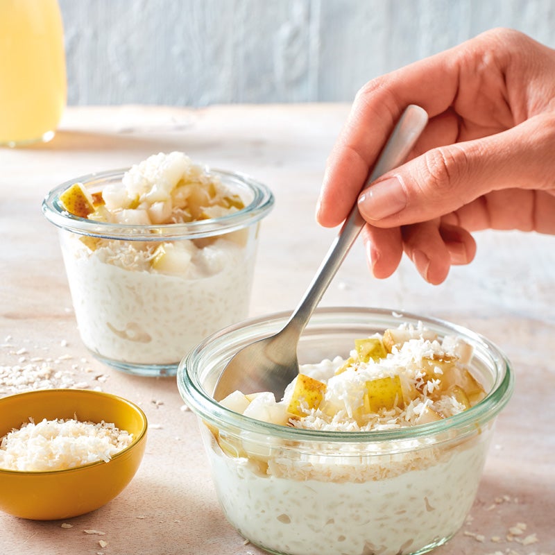 Kokosmilchreis im Glas mit Birne