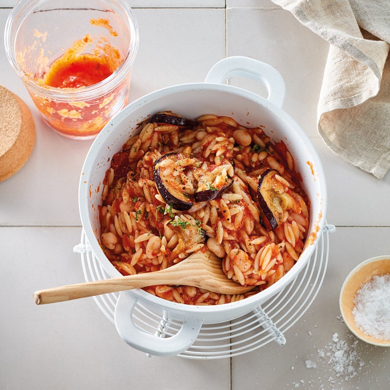 Paprikasauce in einen Topf geben und auf mittlerer Stufe ca. 3 Minuten erwärmen. Bohnen abspülen, abtropfen lassen und mit Nudeln zur Sauce geben. Sauce ca. 5 Minuten köcheln lassen, Auberginen unterheben und Kritharaki mit Paprikasauce servieren.