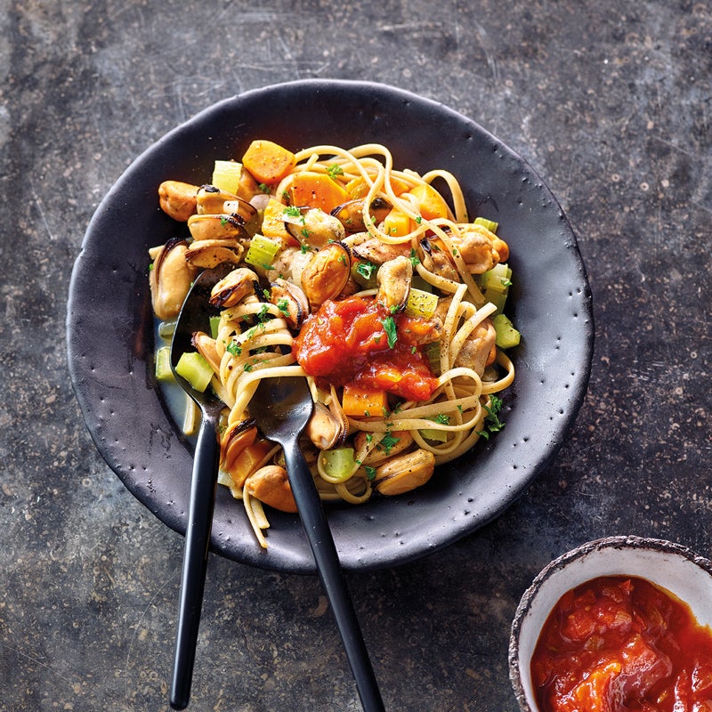 Muscheln unter fließendem Wasser gründlich reinigen und offene Muscheln entsorgen. Wasser in einem Topf aufkochen, Muscheln darin zugedeckt ca. 10 Minuten garen, bis die Muscheln geöffnet sind, dabei zwischendurch schütteln. Muschelfleisch aus der Schale lösen und nicht geöffnete Muscheln entsorgen. Nudeln nach Packungsanweisung in Salzwasser garen und abgießen.
