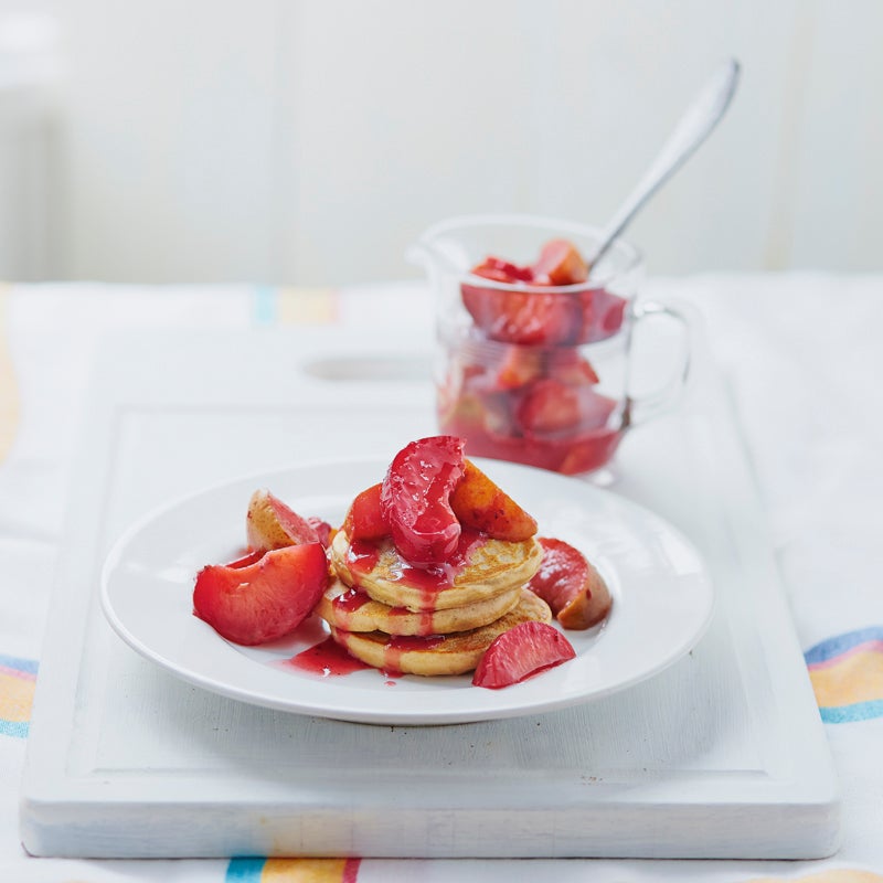 1 TL Öl in einer Pfanne erhitzen. 6 Mini-Pfannkuchen abbacken, dazu je 1 EL Teig mit ca. 5 cm Abstand in die Pfanne geben. Bei mittlerer Hitze ca. 1–2 Minuten garen, bis die Mini-Pfannkuchen hellbraun sind, wenden und ca. 1 weitere Minute garen. Restliches Öl erhitzen und 6 weitere Pfannkuchen abbacken. Je 3 Mini-Pfannkuchen mit Fruchtkompott servieren.