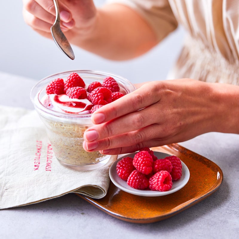Teig in ein Glas (Inhalt ca. 150 ml) füllen und in der Mikrowelle bei 800 Watt 2–3 Minuten garen. Joghurt auf den noch warmen Nussmops geben, Konfitüre grob unterrühren, Himbeeren daraufgeben.