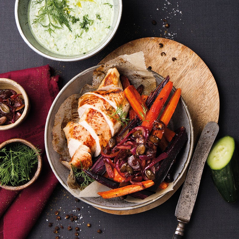 Karotten und Fleisch aus dem Ofen nehmen und auf Tellern anrichten. Zwiebeln, Kürbiskerne und Datteln dazugeben. Gurkensüppchen in Schalen dazureichen und Persische Platte mit Pute und Gurkensüppchen servieren.