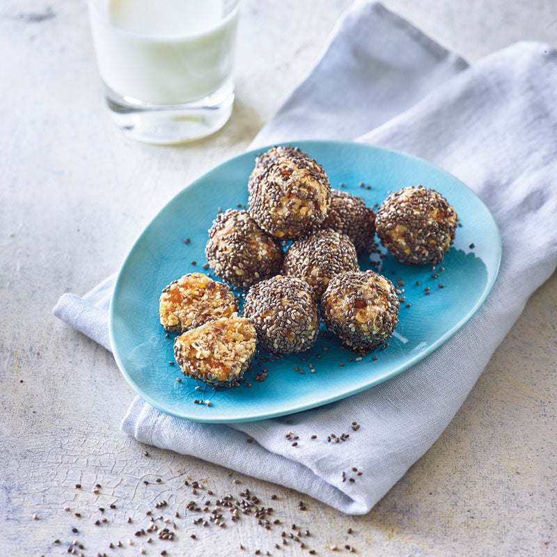 Chiasamen auf einem tiefen Teller verteilen. Aus der Masse mit feuchten Händen 20 Bällchen formen, in Chiasamen wälzen und servieren.