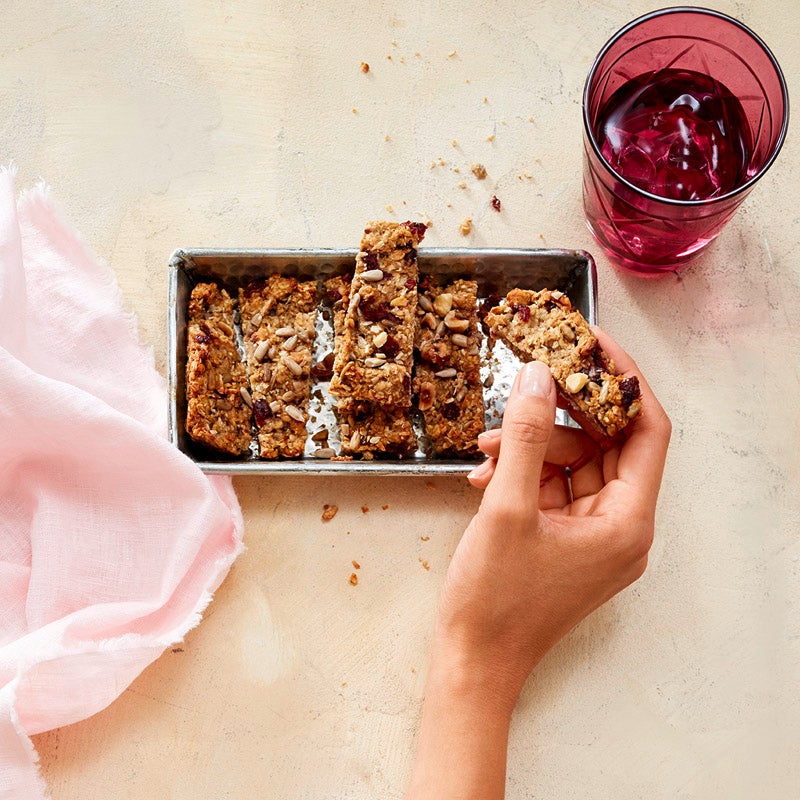 Cranberries und Haselnüsse hacken. Beides mit Kokosraspeln, Sonnenblumenkernen, Haferflocken, Haferkleie, Eiweiß und Zitronensaft unter die flüssigen Zutaten mischen. Teig in einer mit Backpapier ausgelegten eckigen Springform (20 x 20 cm) glatt streichen und im Backofen auf mittlerer Schiene 25-30 Minuten goldbraun backen. Noch warm in 15 Riegel schneiden und ca. 30 Minuten auskühlen lassen. Power-Bars servieren.