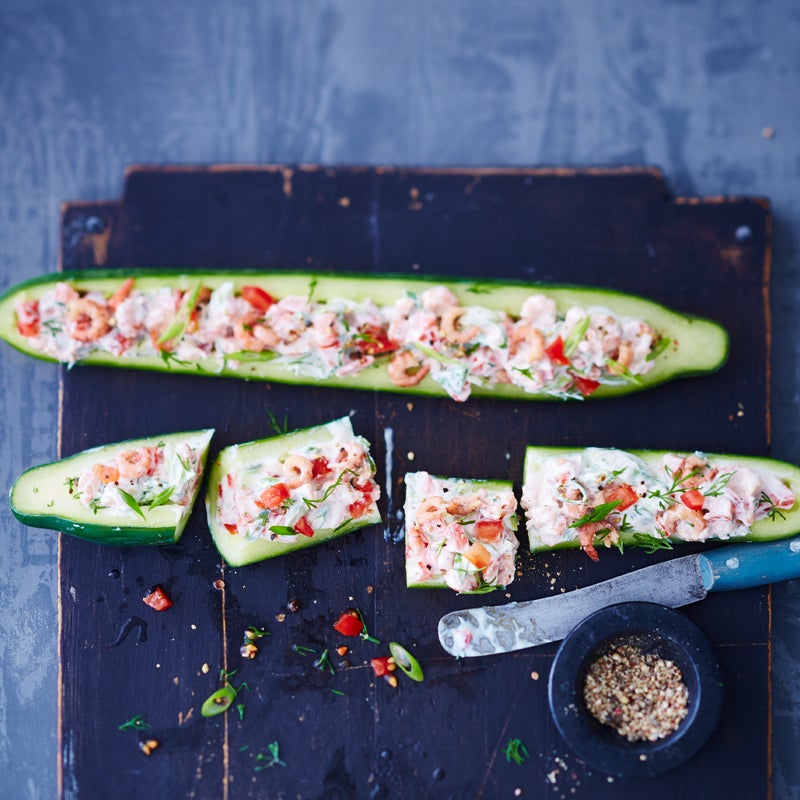 Krabbencreme in die Gurkenschiffchen füllen. Guten Appetit!