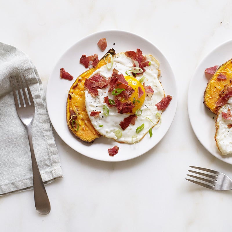 Zum Servieren jede Süßkartoffelscheibe mit 1 TL Käse bestreuen, 1 Spiegelei daraufgeben und mit der Hälfte der Schinkenwürfel und Frühlingszwiebelringen bestreuen.
