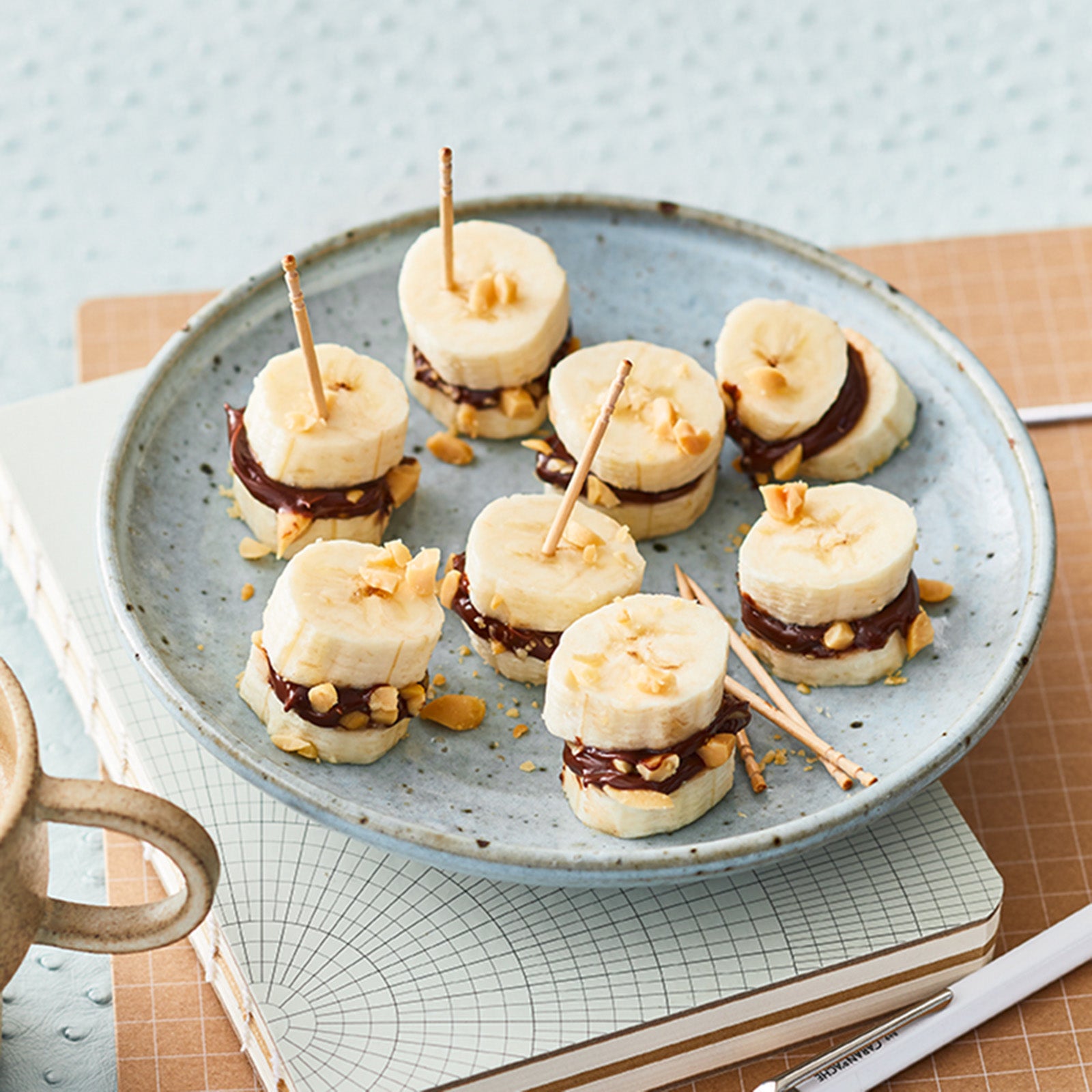 Nuss-Nougat-Creme glatt rühren. Jeweils einen Klecks auf eine Bananenscheibe geben, gehackte Erdnüsse daraufgeben und mit einer zweiten Bananenscheibe bedecken. Yummy!