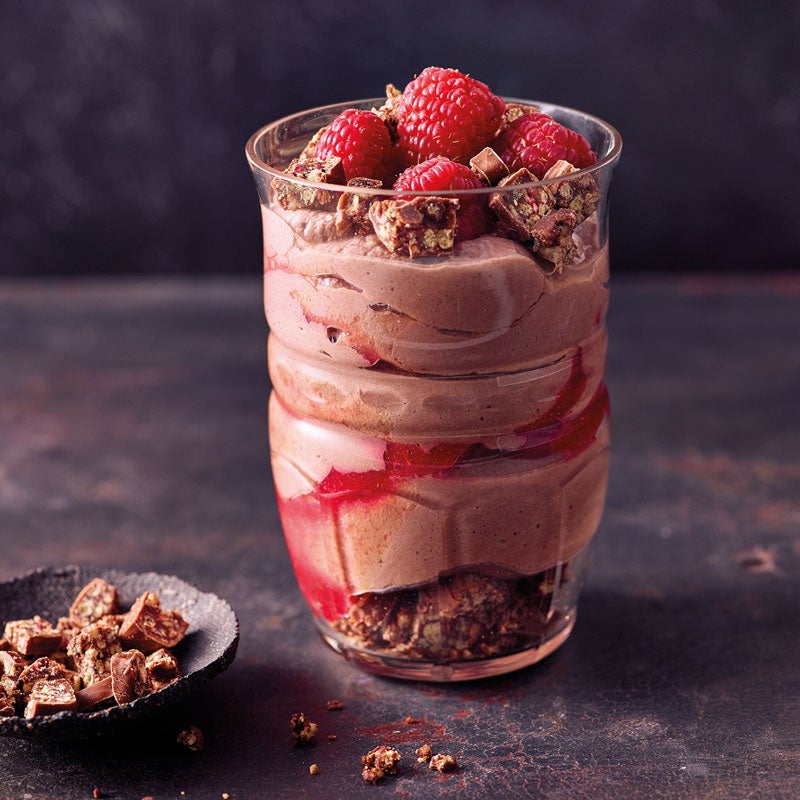 Müsliriegel hacken, drei Viertel der Masse in 4 Gläser (Inhalt ca. 250 ml) füllen und mit Himbeer-Skyr-Creme bedecken. Mit restlichen Himbeeren garnieren und mit restlichem Crunch bestreuen. Schoko-Eiweiß-Trifle servieren.