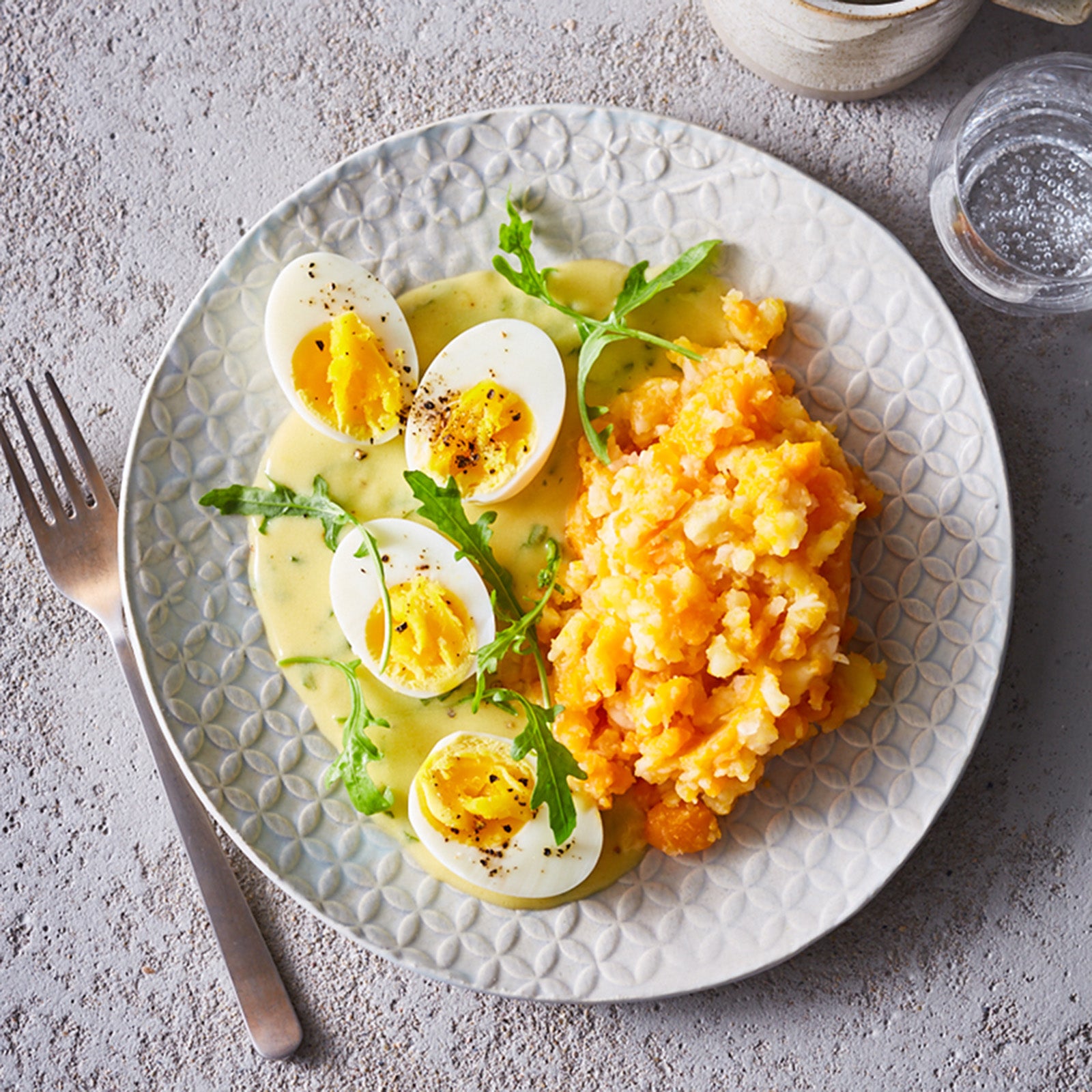 Eier pellen und halbieren. Kartoffel-Sellerie-Karotten-Mix abgießen, dabei 50 ml Kochwasser auffangen. Mix grob zerstampfen, dabei Kochwasser nach und nach zugeben. Mit Salz und Muskat abschmecken.