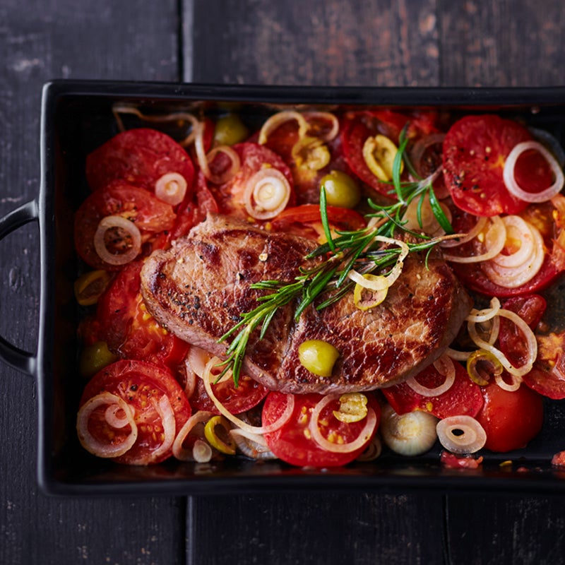 Tomaten, Zwiebeln, Knoblauch und Oliven in eine Auflaufform geben und 1 TL Olivenöl darüberträufeln. Mit Salz, Pfeffer und Rosmarin würzen. Im Backofen auf mittlerer Schiene ca. 25 Minuten schmoren.