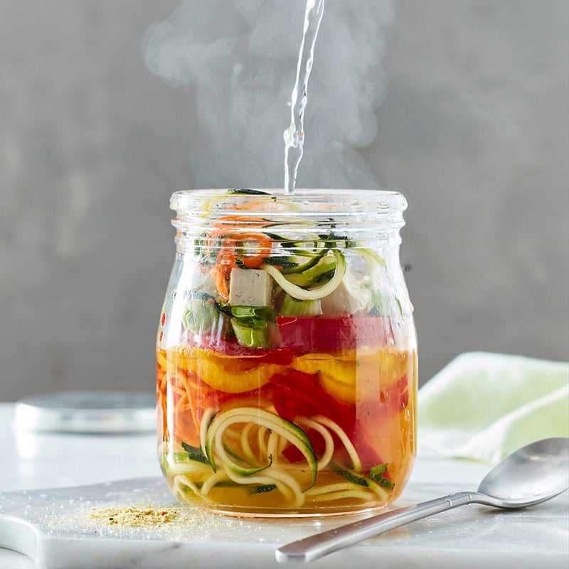 Gemüse und Tofu auf 4 fest verschließbare Gläser (ca. 400 ml Inhalt) verteilen. Je 1 TL Gemüsebrühe daraufstreuen. Terrinen vor dem Servieren mit je 175 ml kochendem Wasser aufgießen, umrühren und ca. 5 Minuten ziehen lassen.