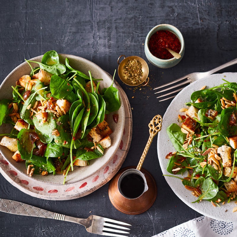 Spinat mit der Zwiebel-Dattel-Mischung vermengen.