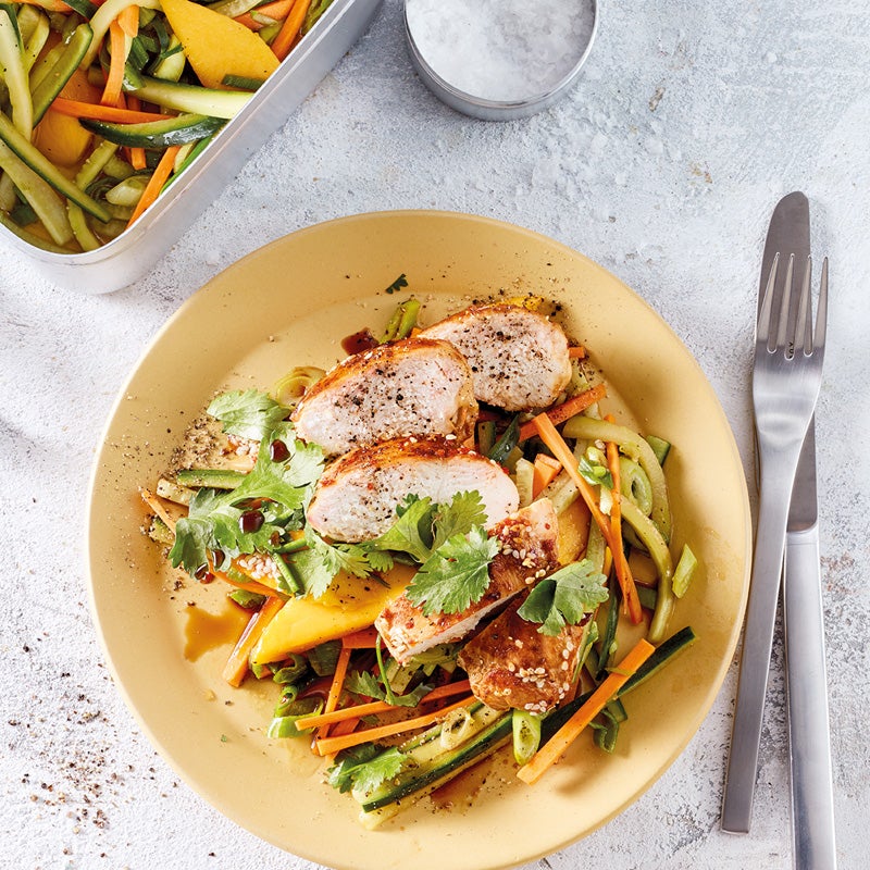 Gurke waschen und in dünne Stifte schneiden. Karotte schälen und in feine Stifte schneiden. Frühlingszwiebeln waschen und in feine Ringe schneiden. Mango schälen und das Fruchtfleisch in Spalten vom Stein schneiden. Für das Dressing restliches Öl, Essig, restliche Sojasauce, Salz und Pfeffer verrühren und mit Gemüse und Mango vermischen.