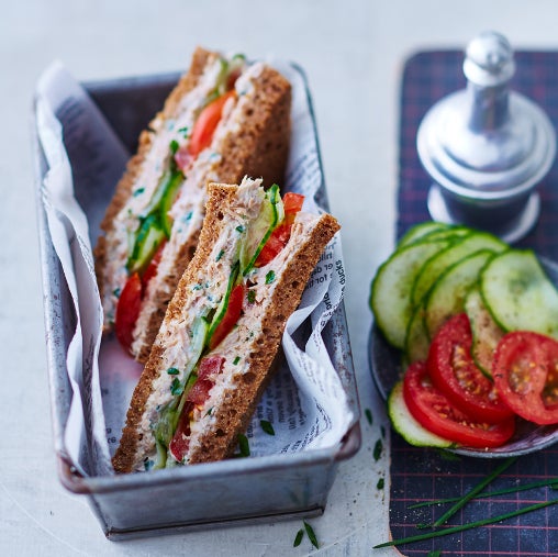 Thunfischcreme auf eine Scheibe Brot streichen, mit Gurken- und Tomatenscheiben belegen. Mit zweiter Brotscheibe abdecken. Restliches Gemüse dazu essen.