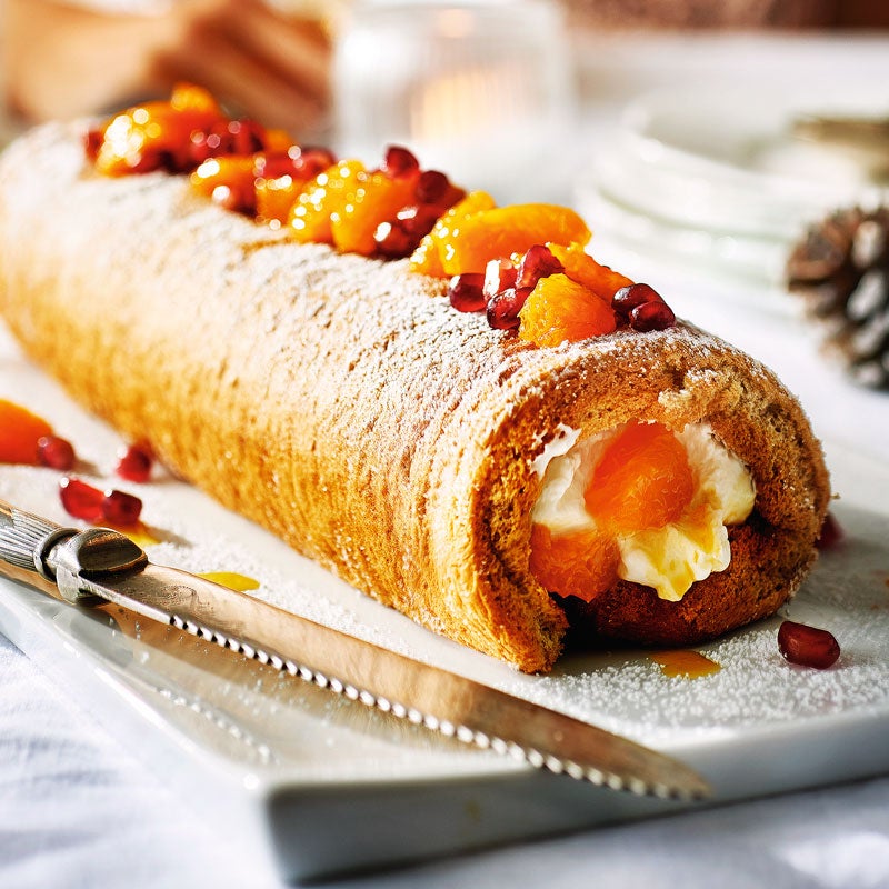 Rolle mit der Verschlusskante nach unten langsam auf einen Servierteller heben. Backpapier vorsichtig entfernen und Biskuitrolle mit restlicher Mandarinenmischung belegen. Mit Granatapfelkernen und Puderzucker bestreut servieren.