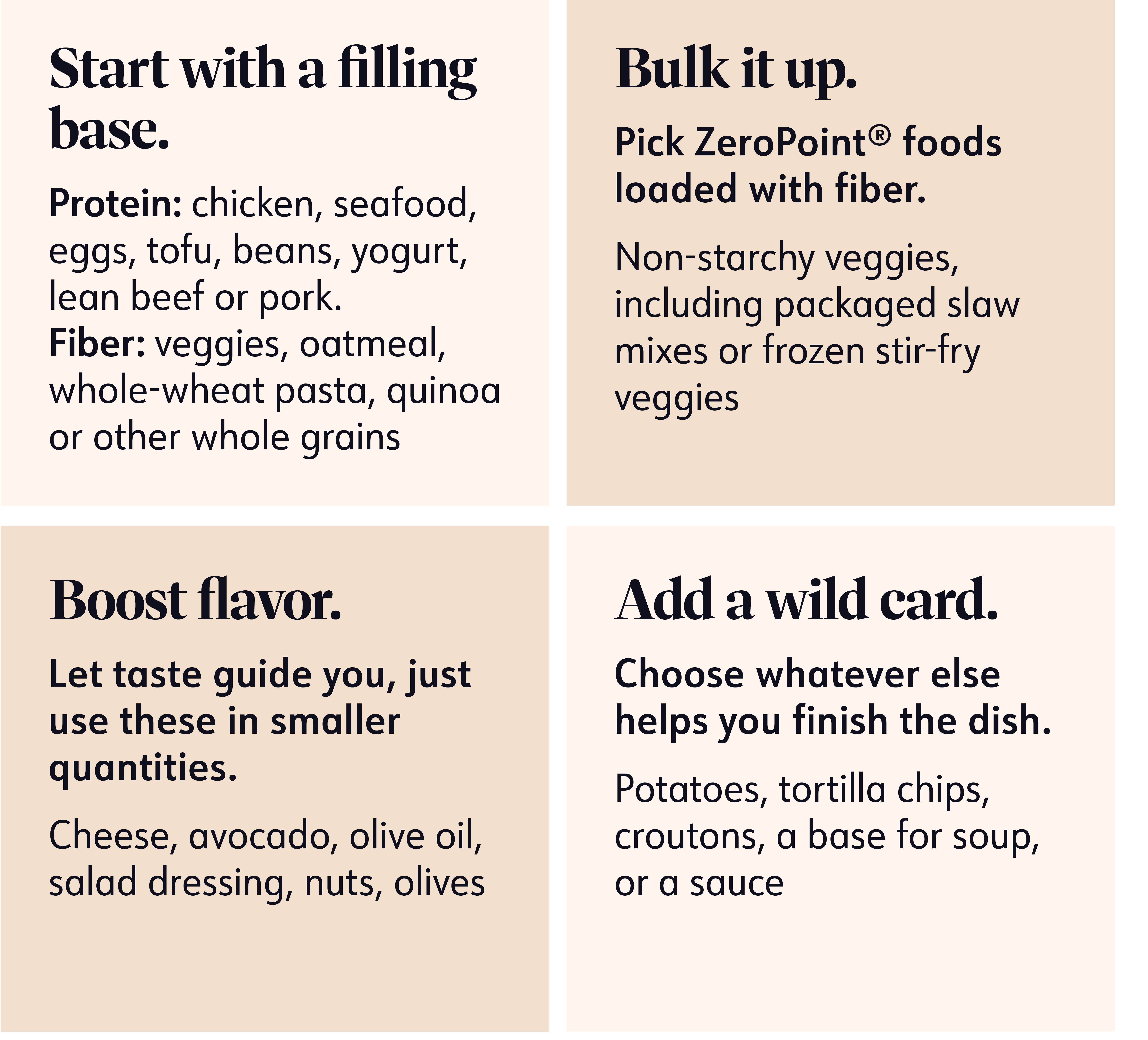 The secret: Building more satisfying and filling meals. Decide how many total Points you want to spend, then choose a food (or foods) from each category.