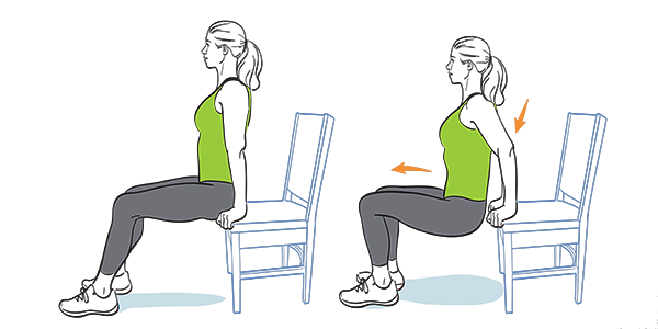 Begin with palms on the edge of a chair, fingers wrapped around seat, feet flat on the floor in front of you, knees bend. Slowly lower butt toward the floor by bending arms, keeping elbows directly over your wrists. Straighten arms, raising butt and engaging triceps. Move feet farther out for a bigger challenge.