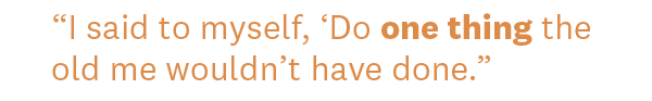 Another goal was to challenge myself in how I was living. I’d say to myself, “Do one thing the old you wouldn’t have done.” One week, for instance, I decided to go to the movies. I had stopped seeing films in theaters years earlier for fear of not fitting into the seats. When I bought that ticket and was able to sit comfortably, I felt a rush of freedom. I also really enjoyed the buttered popcorn.
