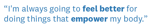 That was the solution I needed. I got over that plateau and continued moving toward my goal, which was a much-needed boost for my health and my self-esteem. Now I know that I'm always going to feel better for doing things that empower my body. I am resilient; I can get through anything. Not every day is going to be perfect, but every day is worth the effort.