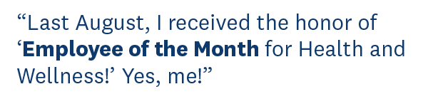 About a month and a half later, my workplace named me “Employee of the Month for Health and Wellness.” Yes, me! Less than a year prior, I had been in my doctor’s office receiving upsetting news. And there I was in August 2019—by then 60 pounds* down—being recognized as a positive influence for others.
