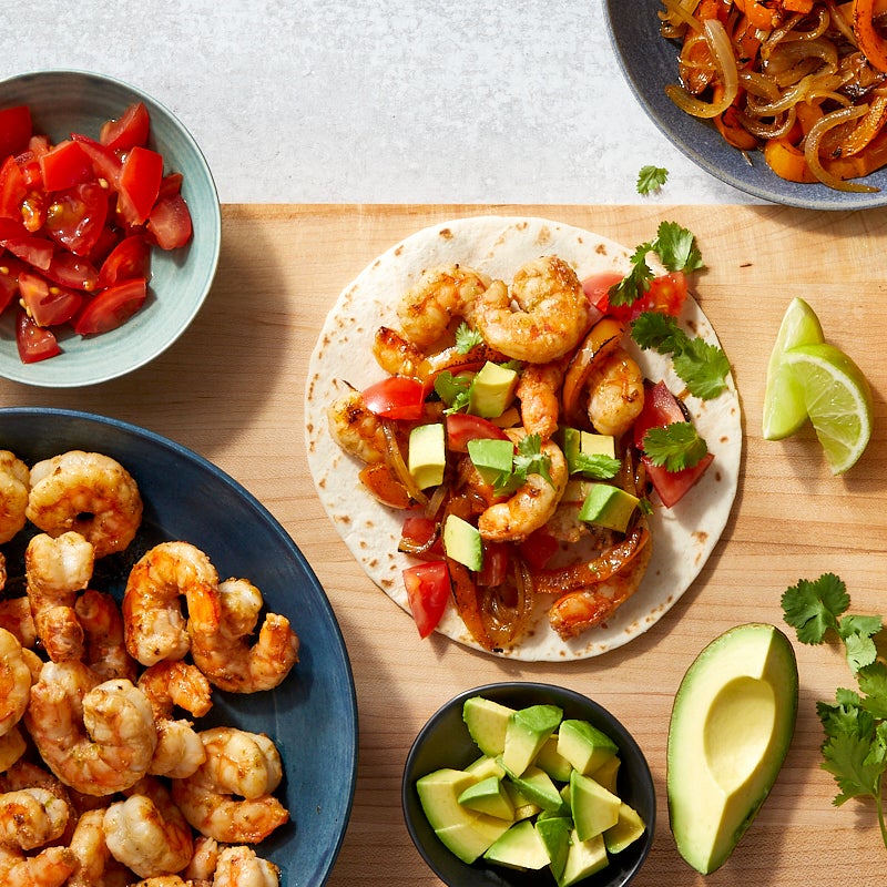Fill the tortillas evenly with the shrimp and vegetables, tomato, avocado, and cilantro. Serve with lime wedges.