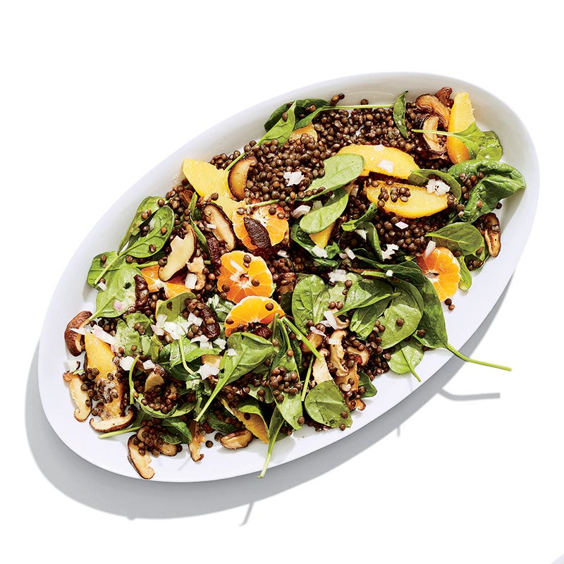 This stunning salad is easy to prepare and full of flavor. Ready in just over an hour, this dish yields a platter full of filling lentils, umami-laden mushrooms, brightly flavored orange segments and tender fresh spinach, all dressed in a ginger-soy dressing with citrus notes. Each hearty serving is two cups, perfect for a main dish salad for a light dinner or lunch. The gorgeous presentation filled with colors and textures makes a wonderful main for a special luncheon with girlfriends, or a central dish on a brunch buffet. Start your next dinner party with this eye-catching salad to garner instant raves. Amp it up with some grilled asparagus would make a super tasty addition to this salad.